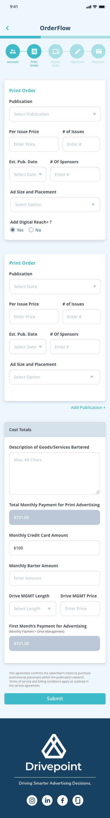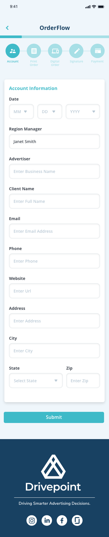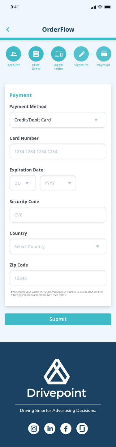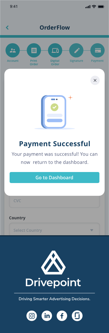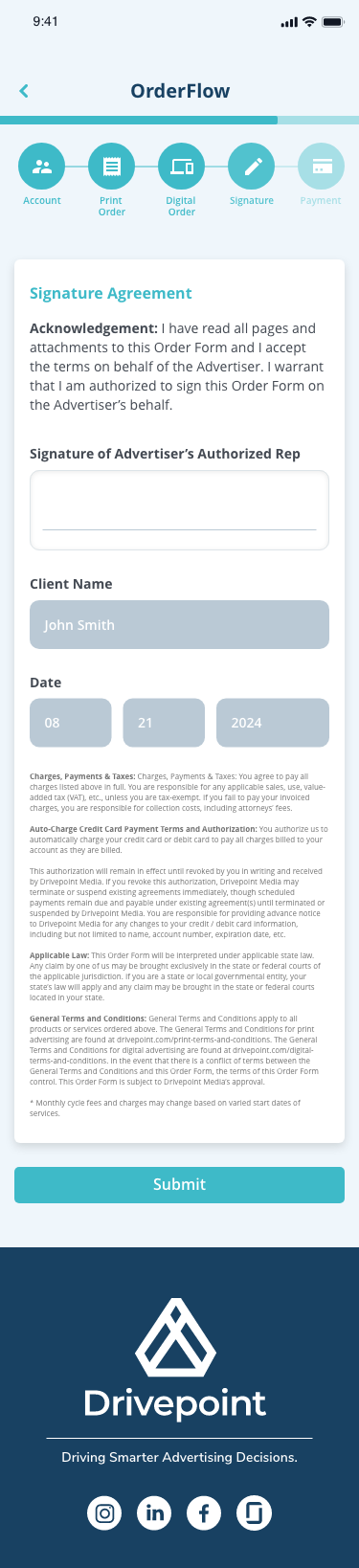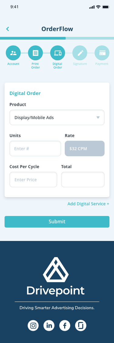 Drivepoint is an advertising operations platform designed to help sales teams create client agreements, manage campaigns, and process payments through a streamlined, step-by-step workflow.