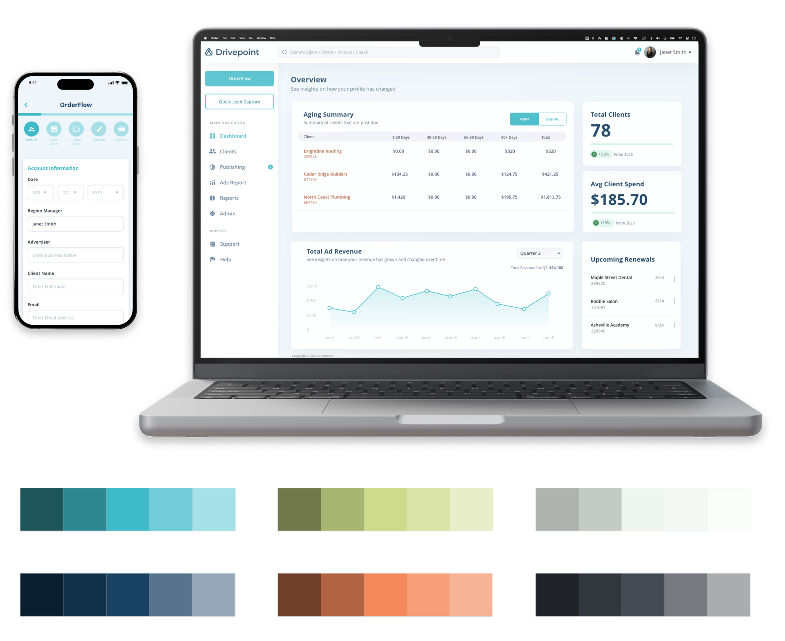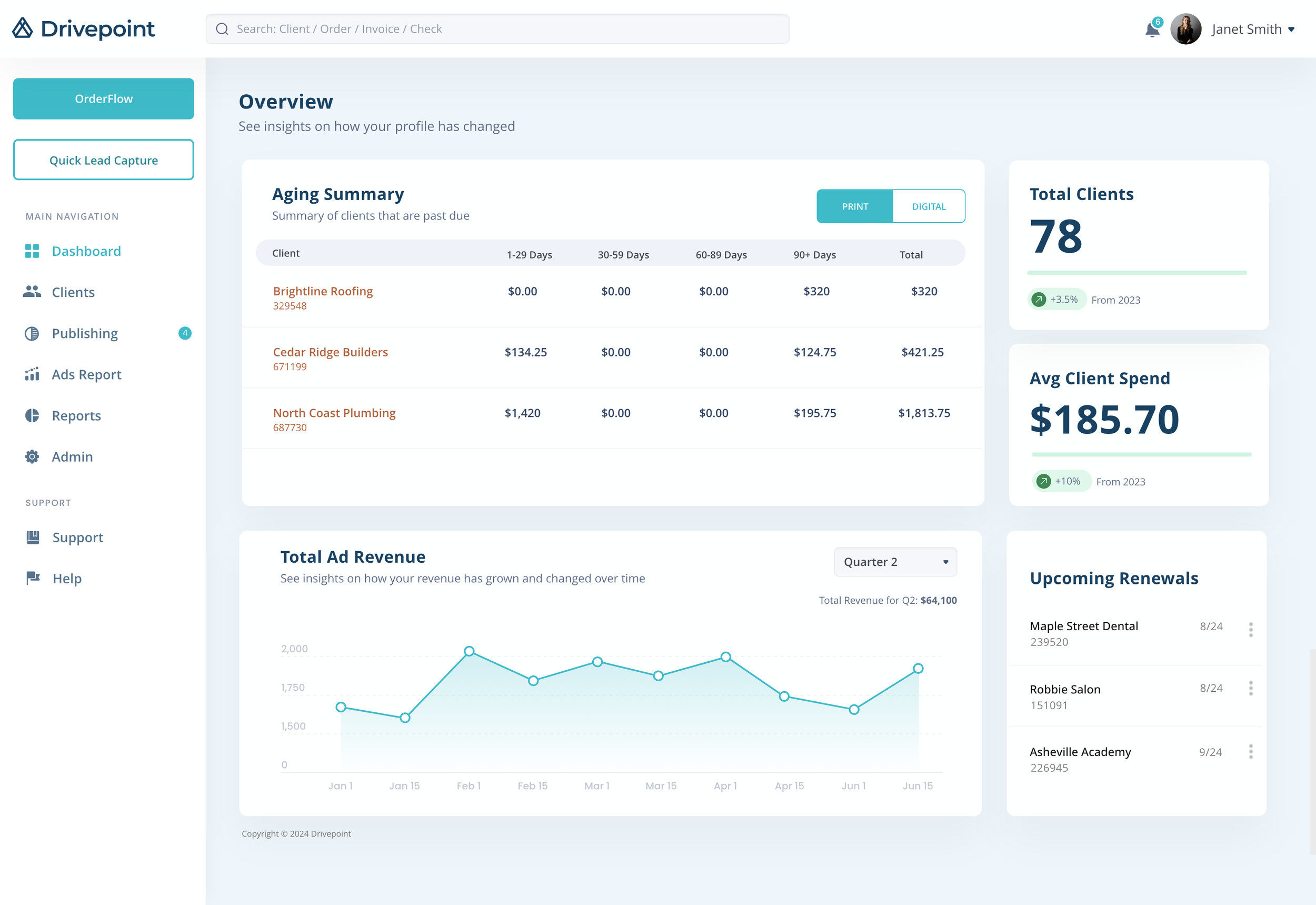 Beyond the guided workflow, the platform includes a dashboard designed to give users immediate visibility into their clients, campaigns, and performance metrics. This view allows sales teams to quickly assess activity, monitor revenue, and take action without disrupting their workflow.